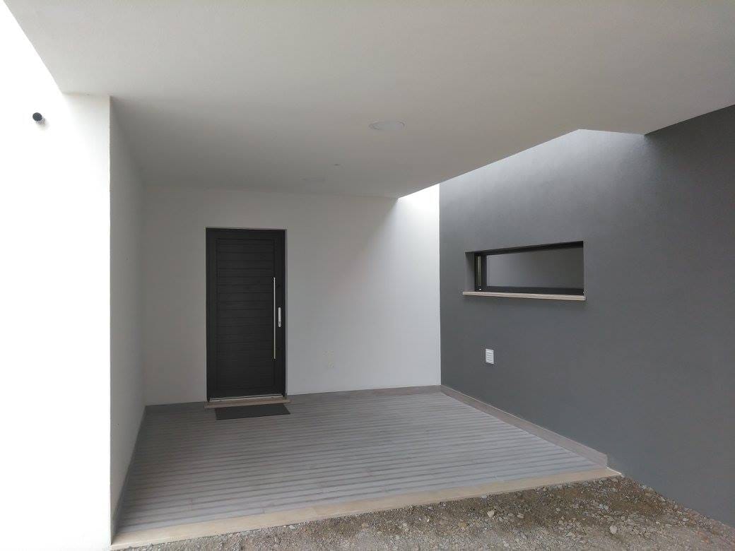 É uma casa wood frame. Moradia de arquitetura moderna com aspecto de alvenaria, mas com as vantagens de construção de madeira.