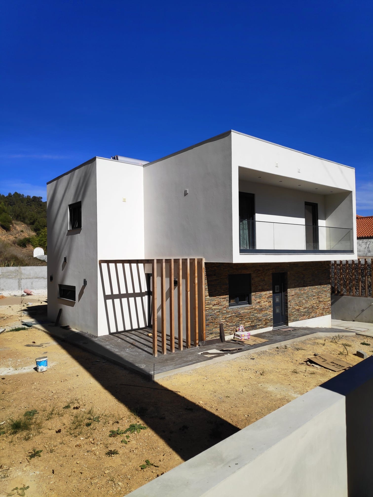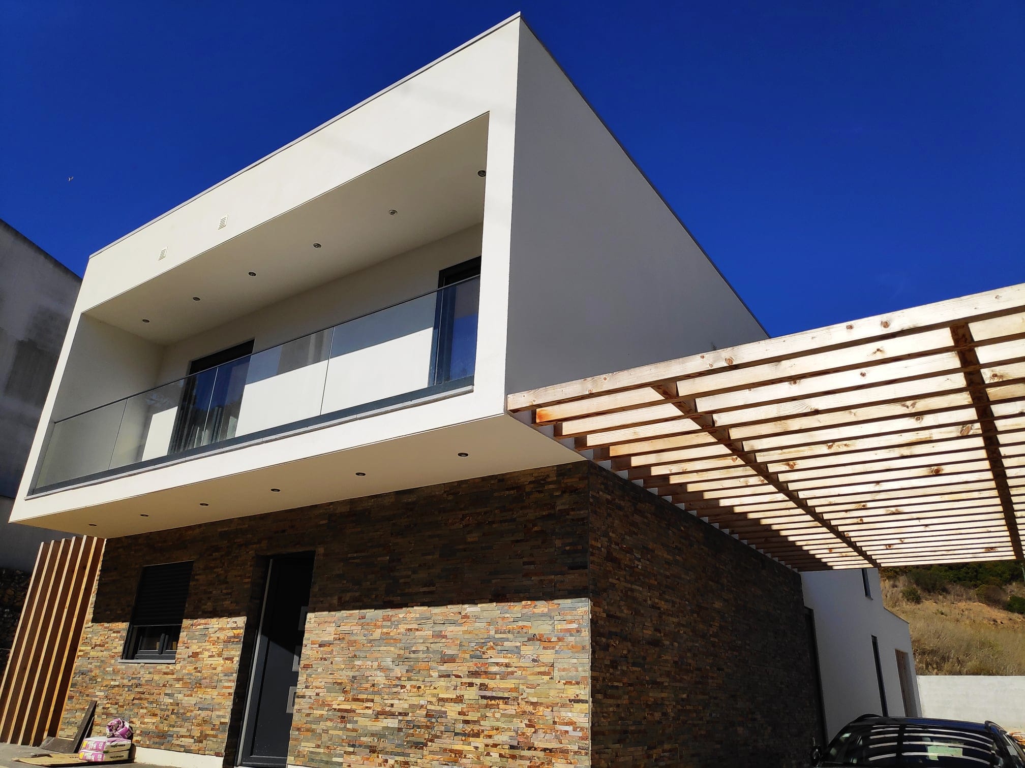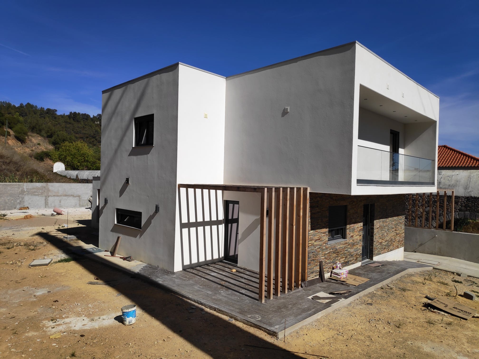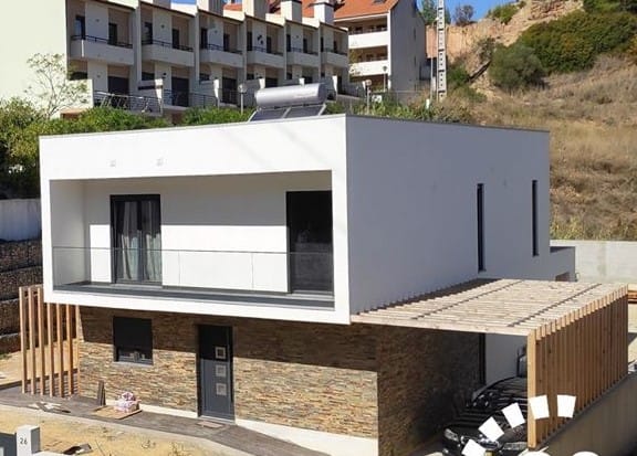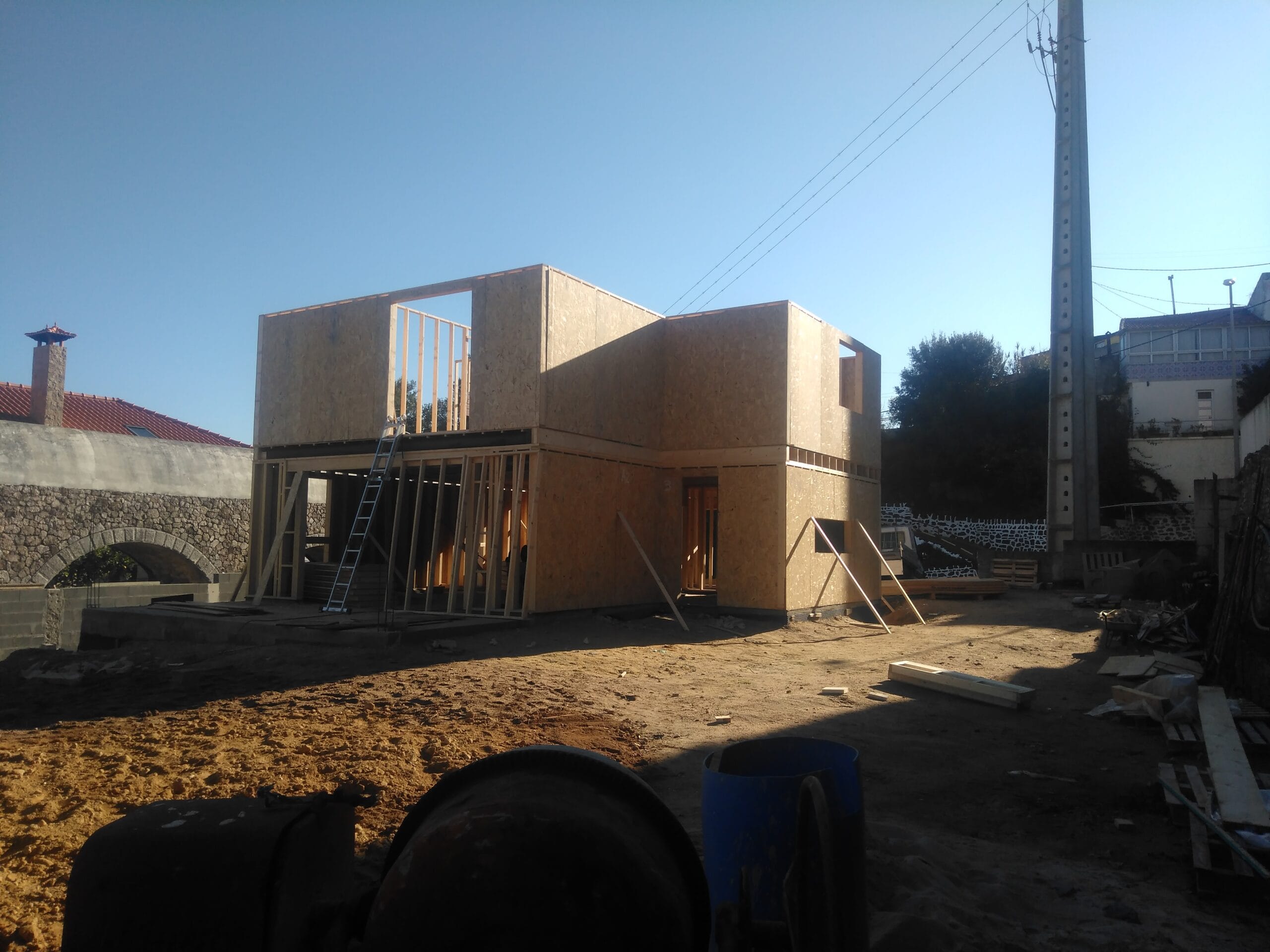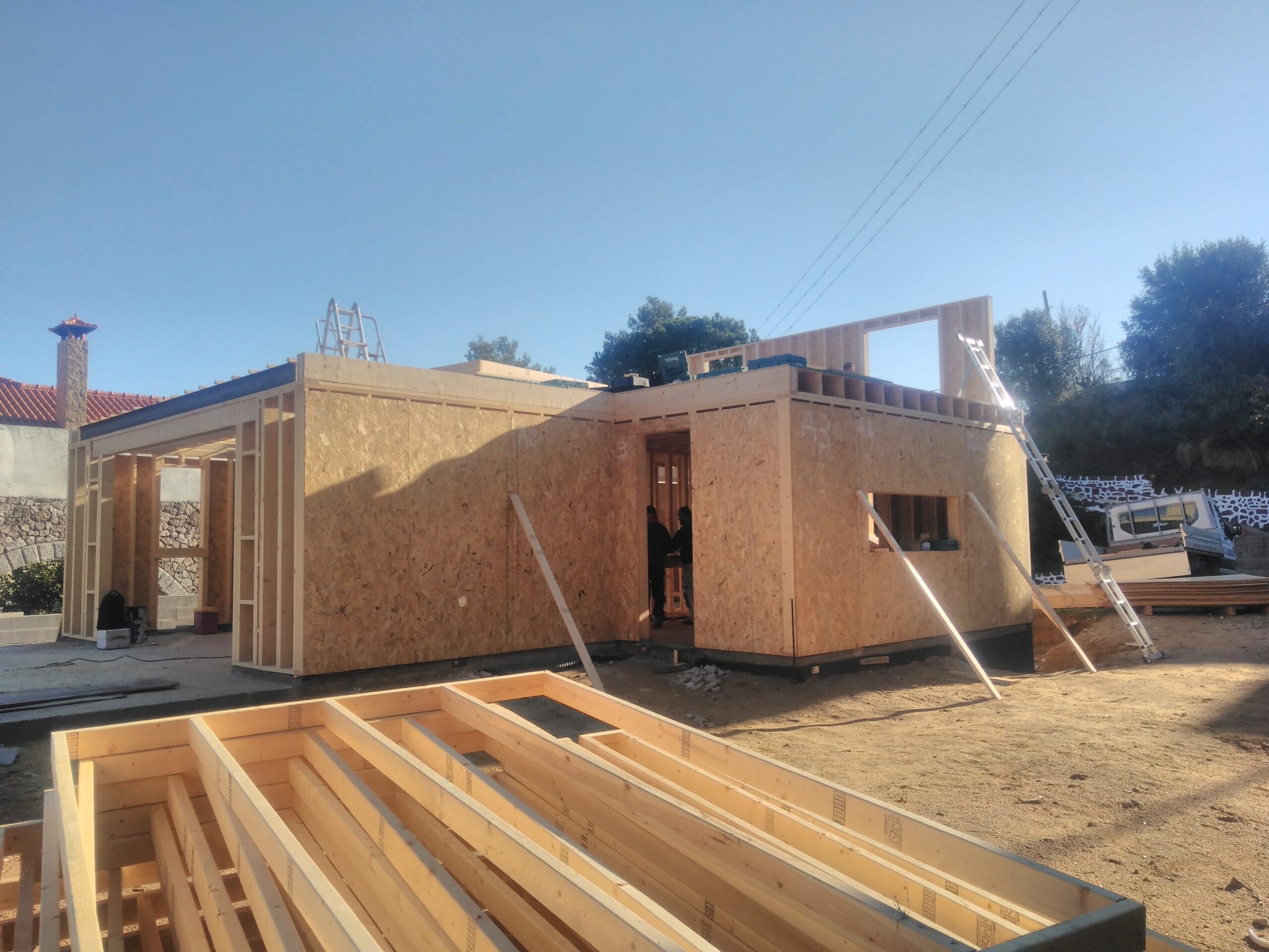 É uma casa wood frame. Moradia de arquitetura moderna com aspecto de alvenaria, mas com as vantagens de construção de madeira.