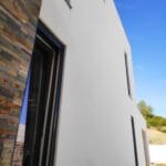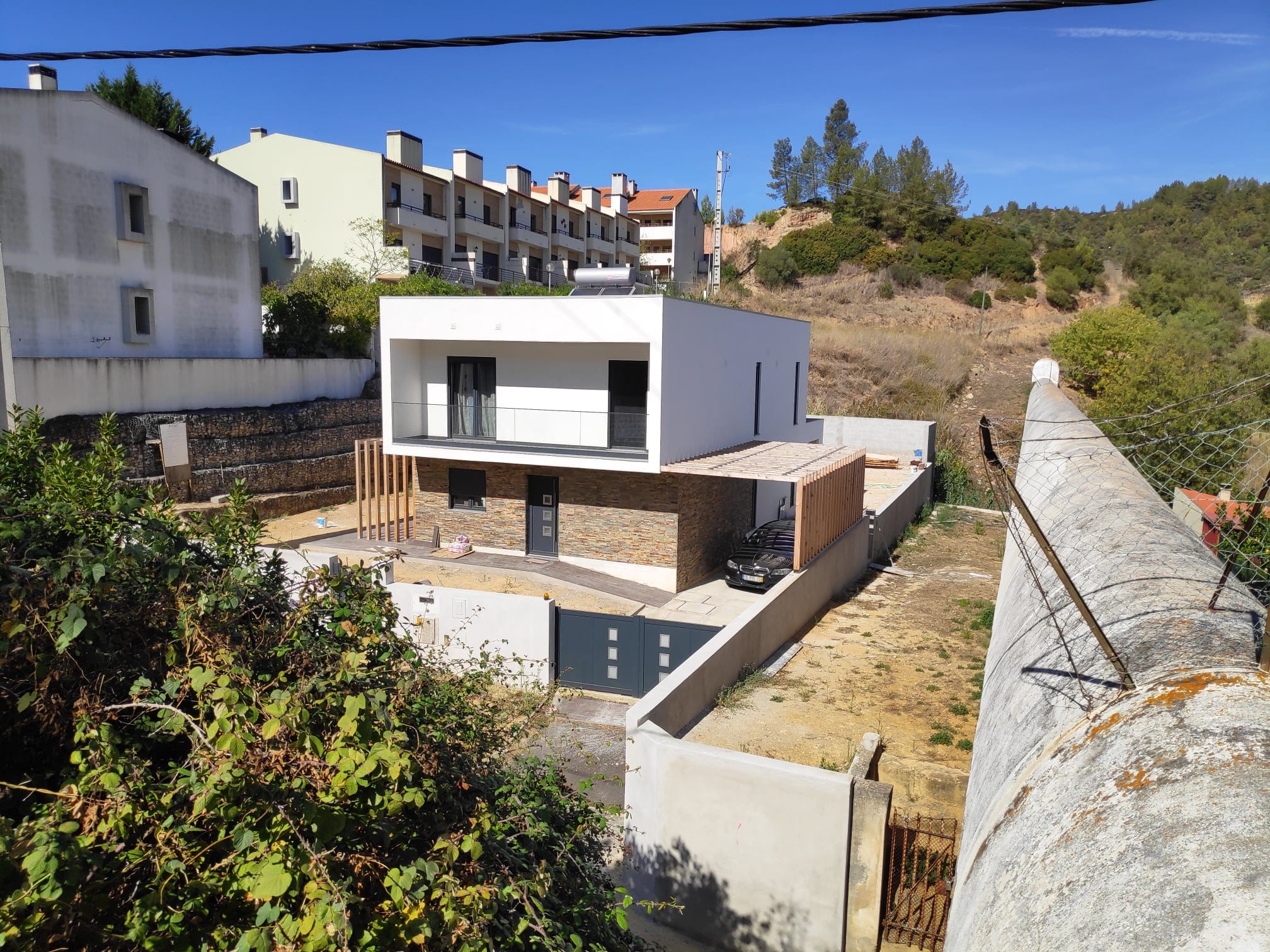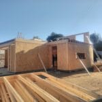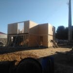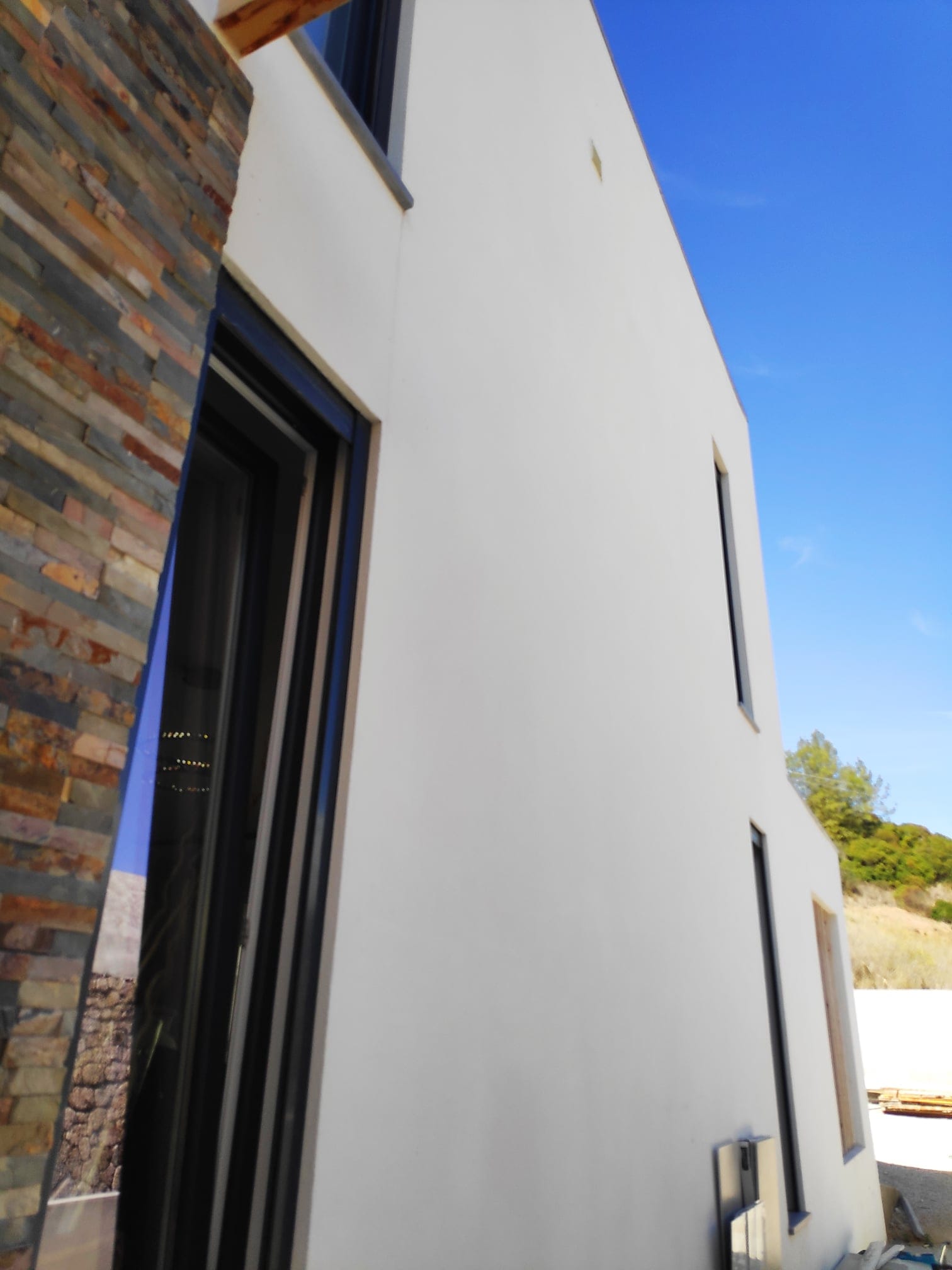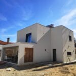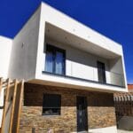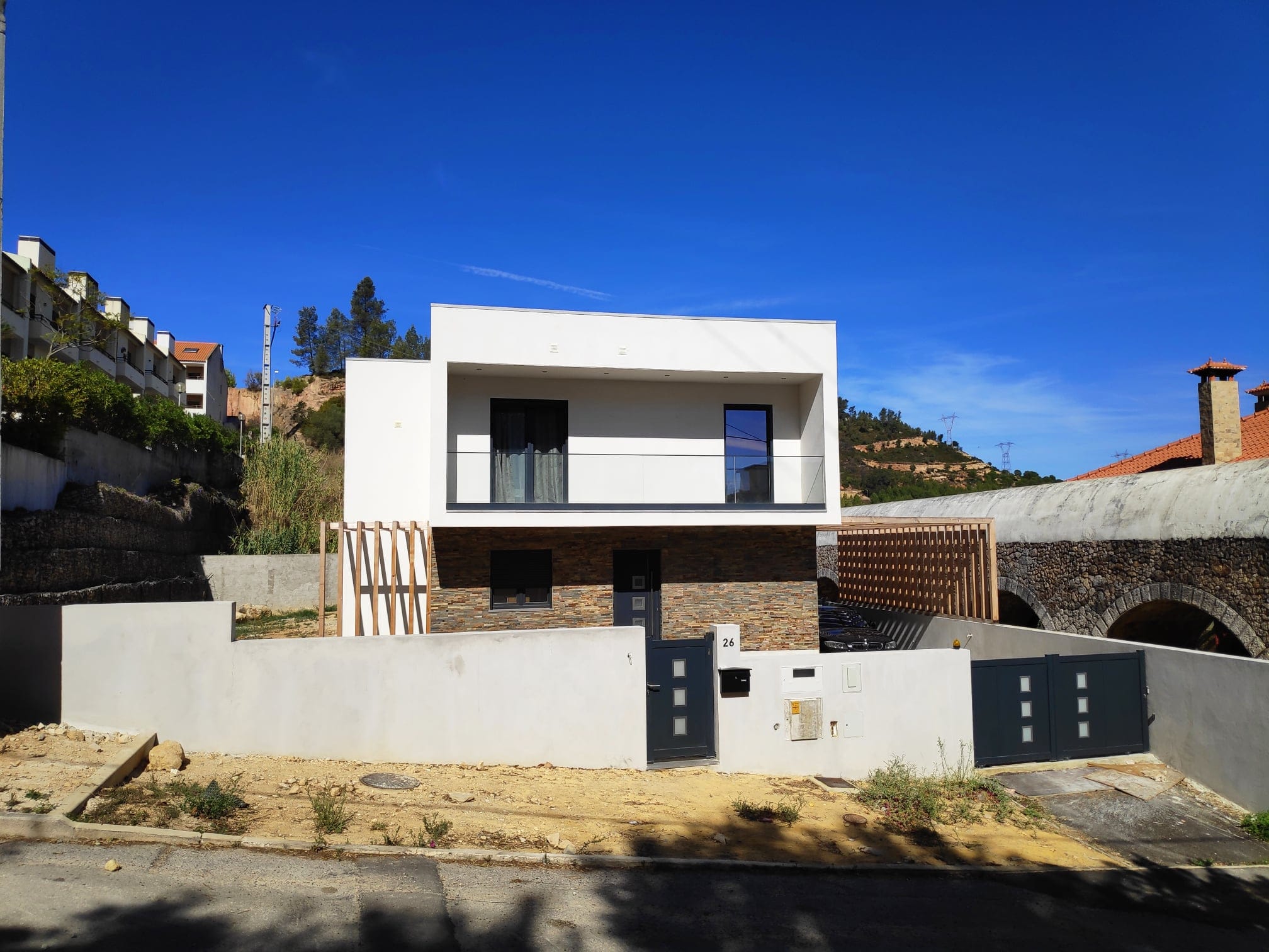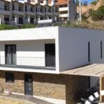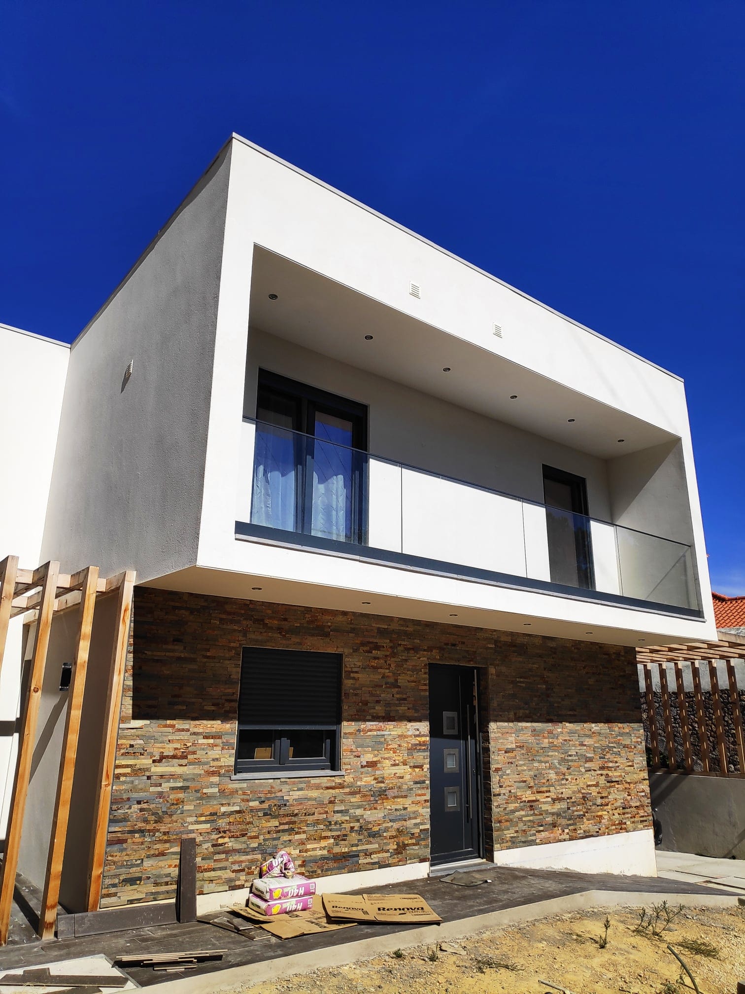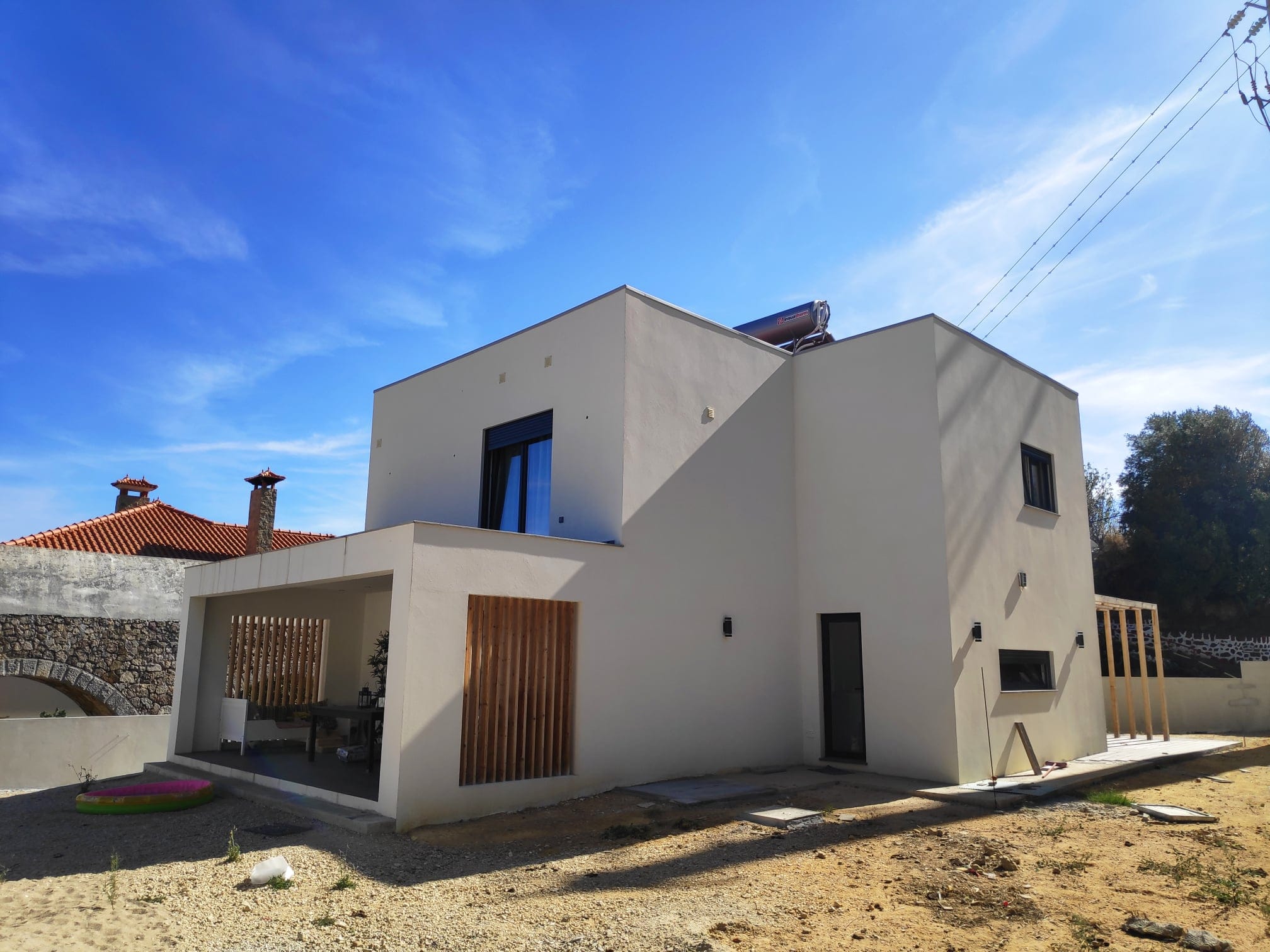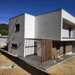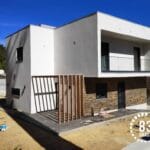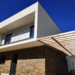 É uma casa wood frame. Moradia de arquitetura moderna com aspecto de alvenaria, mas com as vantagens de construção de madeira.